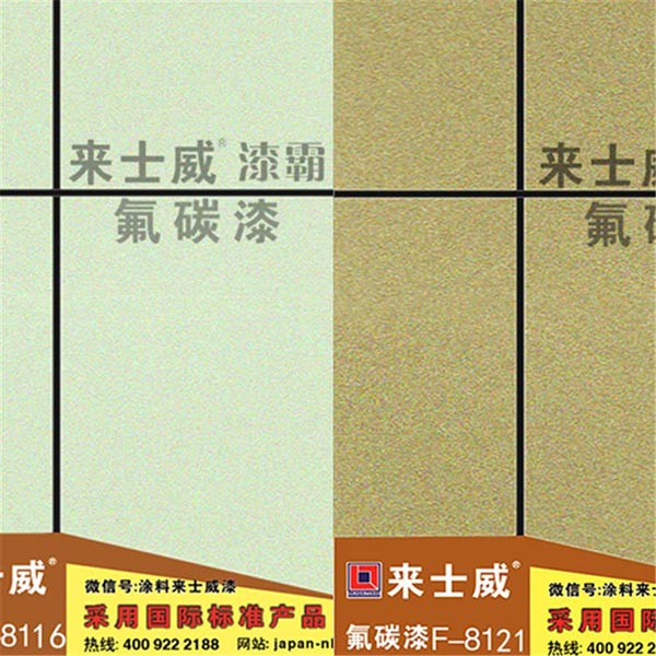 氟碳面漆是選用優(yōu)良氟碳樹脂為基料,添加助劑及各種金屬效果顏料精制而成的雙組份溶劑型外墻漆,具有良好的耐候性、抗污性和抗腐蝕性,金屬效果顏料的隨向異色性賦予漆膜很高的裝飾性和華麗的質(zhì)感。
