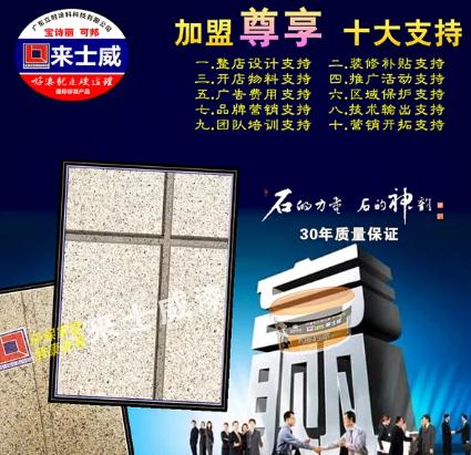 在來士威仿石漆展臺,人氣高漲,前來觀摩產(chǎn)品、了解加盟政策咨詢的用戶絡繹不絕。展臺展示的系列仿石漆及藝術漆產(chǎn)品效果匠心獨具、完美詮釋了來士威仿石漆的獨特魅力!每個系列都有不同的風采,獨特的韻味。集藝術、色彩、技術、環(huán)保與實用于一體。藝術感強、色彩絢麗、紋理層次多變、手感極為優(yōu)越。一經(jīng)展出,咨詢了解的人蜂擁而至。據(jù)介紹,目前來士威仿石漆推出的多項豐厚的加盟政策,可以幫助經(jīng)銷商輕松實現(xiàn)低風險、高收益的經(jīng)營。對于希望創(chuàng)業(yè)或尋求事業(yè)發(fā)展突破的人士來說,來士威仿石漆是一個理想的選擇。